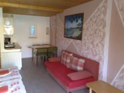 Die Ferienwohnung ist aufgeteilt in Essbereich mit Küche, Schlafbereich und gemütlicher Sitzecke.